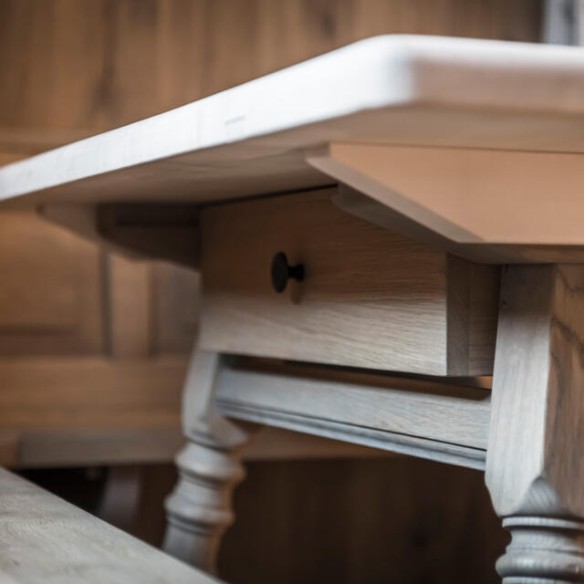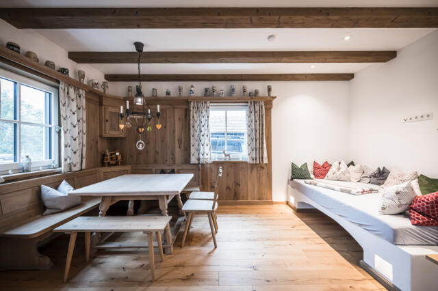 Genießen Sie das Zusammensein an unserem Joggeltisch, umgeben von einer Wandverkleidung in gehackter Eiche. An der klassischen Eckbank erleben Sie traditionelle Gemütlichkeit und rustikalen Charme in Ihrem Zuhause.