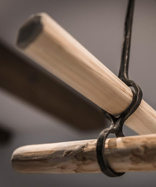 Handgeschmiedete Ofenstangen aus Eisen lassen die handgeschnitzten Holzstangen elegant über dem Ofen schweben, perfekt zum Trocknen des nassen Mantels nach einer Bergtour oder zum trocknen der Kräuter.