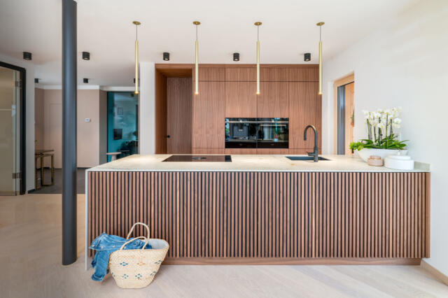 Die Nussbaumlamellen schaffen nicht nur eine ansprechende Optik, sondern auch zusätzliche räumliche Tiefe. Hinter ihnen verbirgt sich praktischer Stauraum für Geschirr.